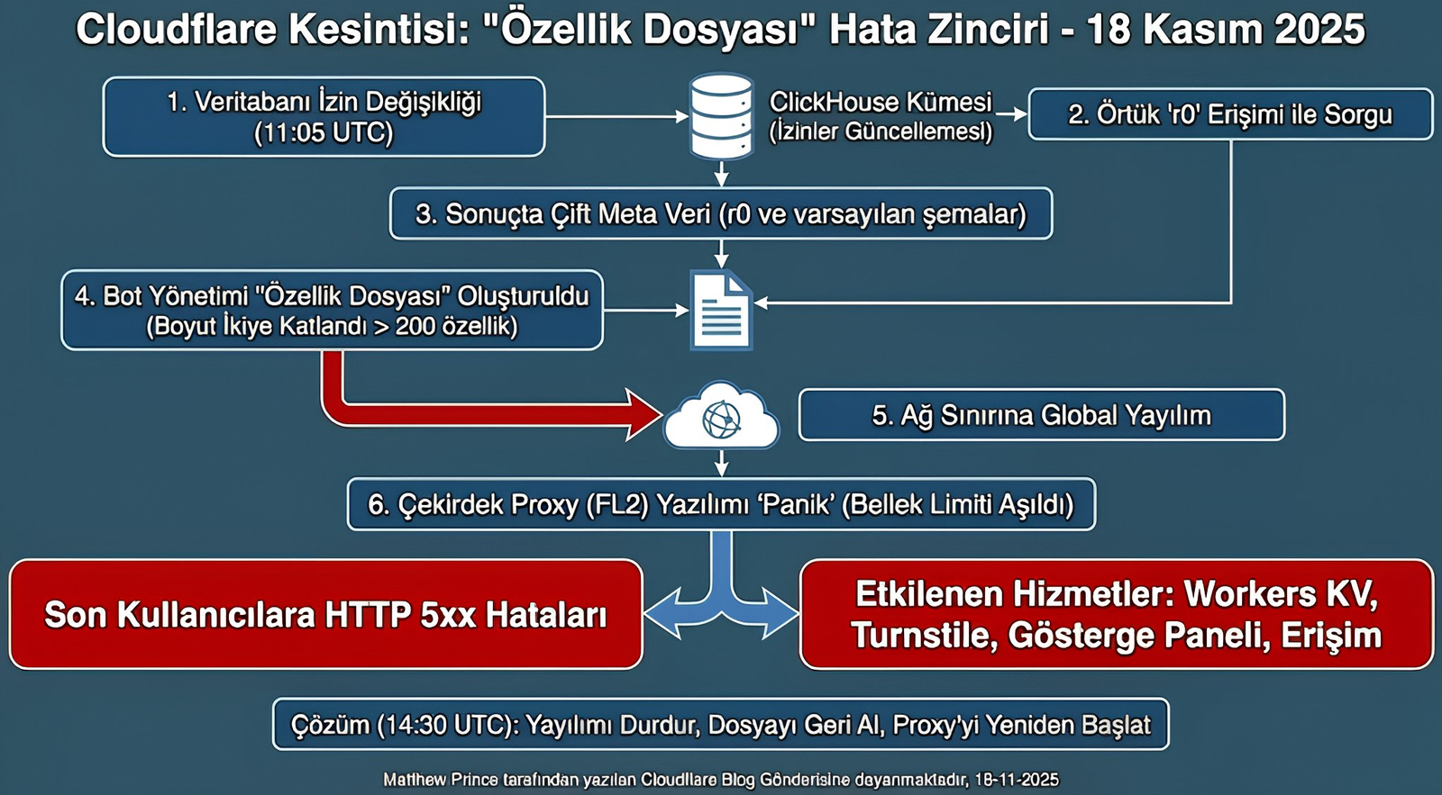 Peki interneti kilitleyen bu sorunun kaynağı neydi? Yapılan açıklamaya göre veritabanında yapılan bir değişiklik dosya boyutunun beklenenden fazla büyümesine neden oldu. Bu durum sistemdeki bir limiti aşınca Rust modülü "panikledi" ve temel proxy sunucularını çökertti. Sonuç: Tam 2 saat 36 dakika süren küresel bir sessizlik.