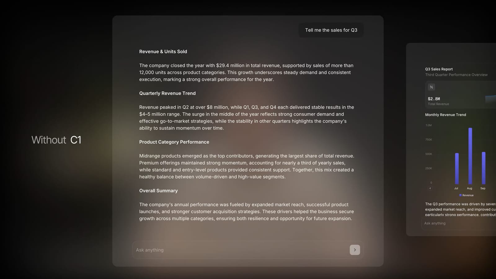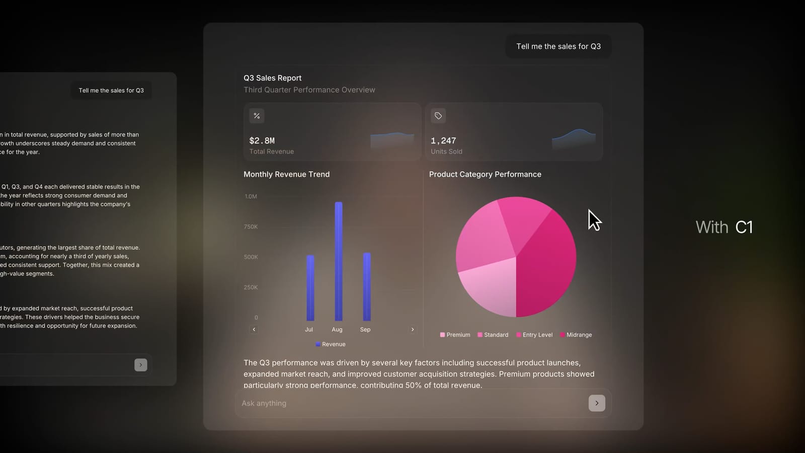 Thesys geliştirdiği C1 Generative UI API ile yapay zeka deneyimini bir üst seviyeye taşıyor. Artık kullanıcılarınıza uzun metinler okutmak zorunda değilsiniz. Thesys sayesinde yapay zeka çıktıları anında tıklanabilir grafiklere, doldurulabilir formlara veya interaktif kartlara dönüşüyor.